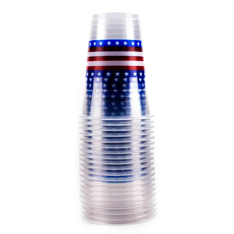 Be prepared for your next patriotic party with these flag themed plastic cups. They feature an all around flag print that stands out at a party. They are disposable and provide easy clean up after the party. This package comes with 20 cups and they hold 16 ounces of liquid.