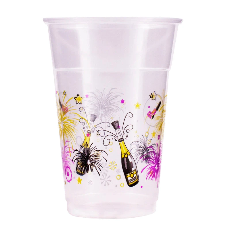Bring in the new year with these specialty plastic New Year themed cups. These cups are perfect for your new years eve party to serve your friends and family. They feature champagne bottles and fireworks on the cups and they are perfect for any cocktail. These cups come packed with 20 cups and hold 16 fluid ounces.ย ย ย