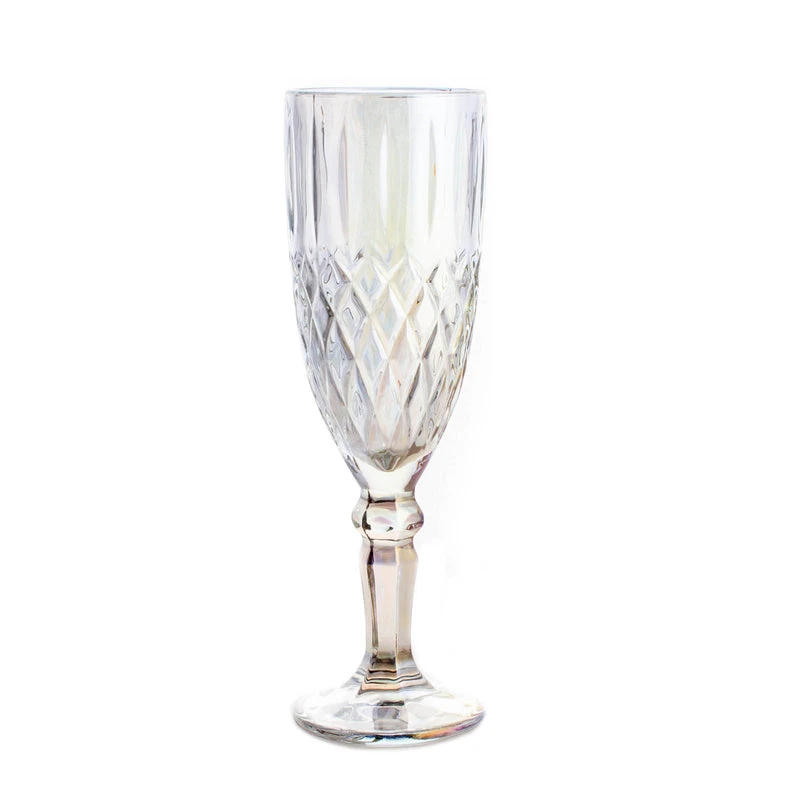 This Iridescent Diamond Pattern Flute is a must have for your home or professional bar. Each glass measures 7.5″ in height with a rim diameter of 2″ and has a max liquid capacity of 5.5 ounces. It is made of durable thick glass and has a crystal clear brilliance with a light shade of metallic colors. This glass has embossed diamond shaped patterns along the bottom of the glass and an embossed vertical line pattern along the top of the glass. Only available in a box of 6 or a case of 24.