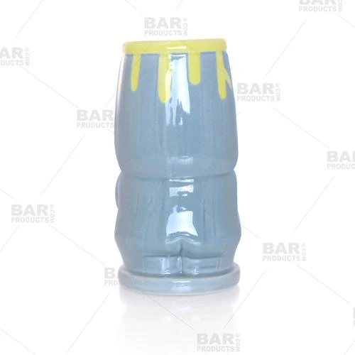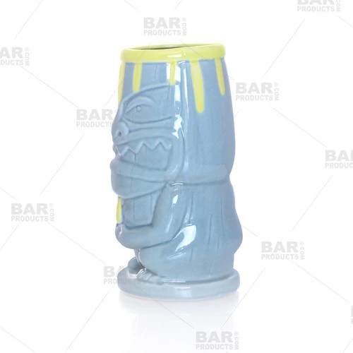 Take a whimsical approach to your next tropical gathering with this mean looking tiki man sporting a āTieā ceramic mug. Another great piece from the extensive BarconicĀ® Tiki Drinkware collection, this full figured āTieā wearing tiki mug is a must-have in our newly released tiki collection. He stands about 5.75″ tall and holds up to 12 ounces of intoxicating and desired liquid. Showcasing a full body, his grinning mouth of pointed teeth and arms below a small yellow tie are the main focal point while he appears to be of a very short legged stature. This fun tiki mug is even a great piece to serve frozen drinks at any outdoor party or other event. The blue colored glaze and yellow tie accent offers a smooth to the touch and glossy to the eye finish, making this tiki drinkware piece a great addition to any bartending collection.
