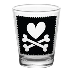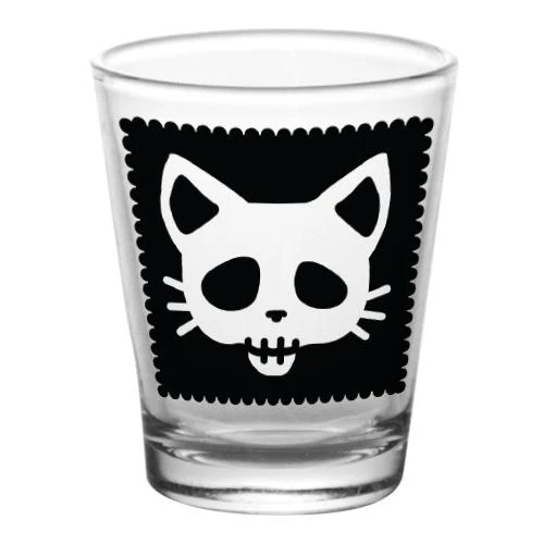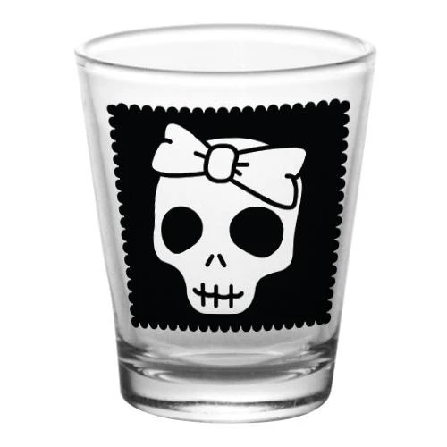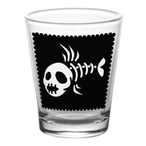 Our popular 1.5oz clear shot glasses featuring the most adorable dead things ever put on glassware. Each glass in the series has a different character, as pictured, including a cute skull with a bow, fish bones, a heart-n-crossbones, a bunny with a carrot skeleton, a skull kitty, and zombie puppy with his bone. Available in black, the screenprinting is washable and durable. They make for a great gift and are priced to move!