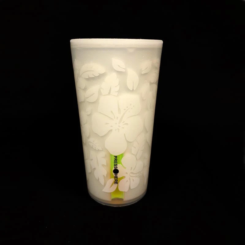 Glow Cup with a hibiscus flower design. Fun for all ages and great for island parties. Crack the green glow ampules by squeezing the bottom sides of the cup. This cup will glow 1 time only. Measures 5 ½” Tall x 2 ¼” Base x 2 ¾” Rim.