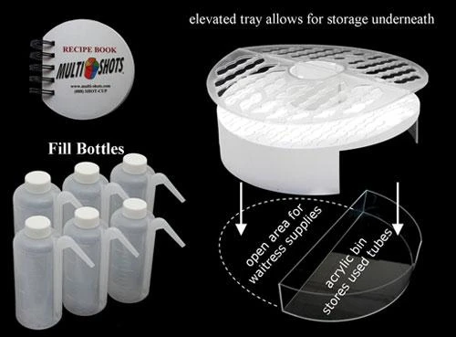 Bring some excitement back to tube shots and serve the right shots to your customer every time with the Multi-Shots serving tray and disposable serving cups. The Multi-Shots serving tray carries 18 different ingredients in individual serving cups that snap together to form one shot glass. Your shot girl will make the shot right in front the customer and with 67 possible combinations you will never get bored with the Mult-Shots tray.