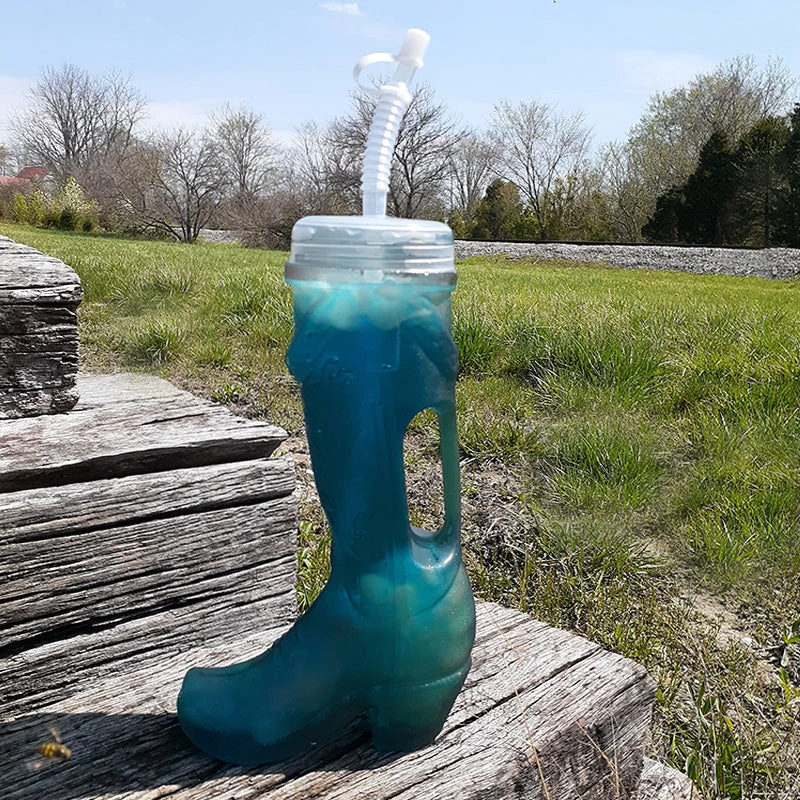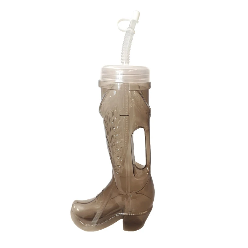 New 32 ounce plastic smoke colored cowboy boot cup. The plastic is molded to a designer cowboy boot that not only gives the appeal of Old Western footwear but also provides a handle to hold it. Comes with a lid that screws on tightly, straw and straw cap. Your guests will be saying a big YEE-HAW! Measures 10.5” H x 5.5” W x 2 ⅜” Rim.