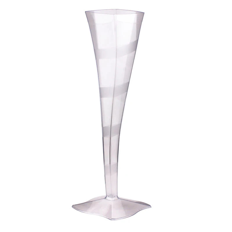 These stylish and durable wavy flutes are sure to Impress your guests at your next party. Serve many types of drinks such as champagne, sparkling juices and much more. These flutes are a great addition to both casual and formal dining. Each cup is made of durable plastic and has a measurement of 9.5″ tall and has a liquid capacity of 5 ounces. Each pack of cups comes with 6 flutes.